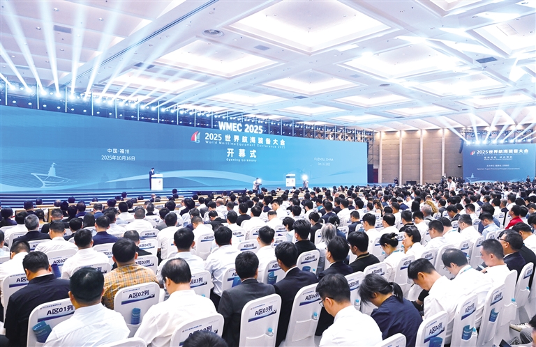 这是10月16日拍摄的2025世界航海装备大会开幕式现场。10月16日,以“福海扬帆 绿动领航”为年度主题的2025世界航海装备大会在福建省福州市开幕。本次大会主要有开幕式、福建省海洋经济产业合作创新发展大会、航海装备大会论坛(主论坛)、海洋科创“五链融合”推进活动以及10余场分论坛。大会同期还举办2025第三届中国海洋装备博览会等多场活动。