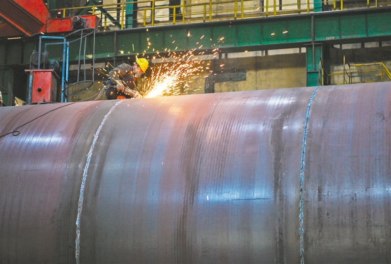 10月21日,在位于包头市的中国二冶集团钢构分公司生产车间,工作人员正在制作风力发电机塔筒。入秋以来,该公司吹响项目生产“冲锋号”,生产线满负荷运转,全力完成风机塔筒订单,保障新能源项目建设进度。本报记者 孟和朝鲁 摄
