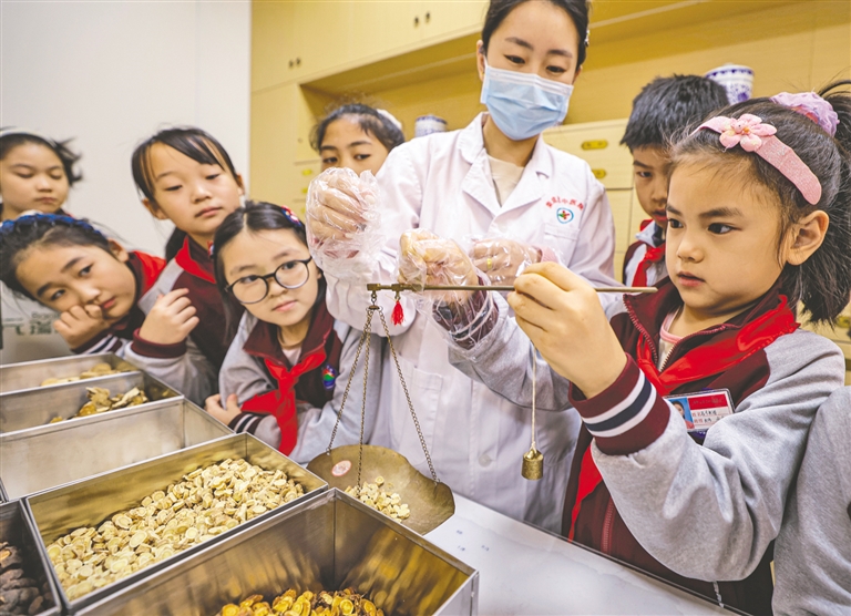 10月22日,在山东省荣成市中医院中医药科普馆,学生学习称量中药材。10月22日是世界传统医药日,各地组织开展中医药文化体验主题活动,让大家了解中医药知识,感受中医药文化魅力。 新华社发