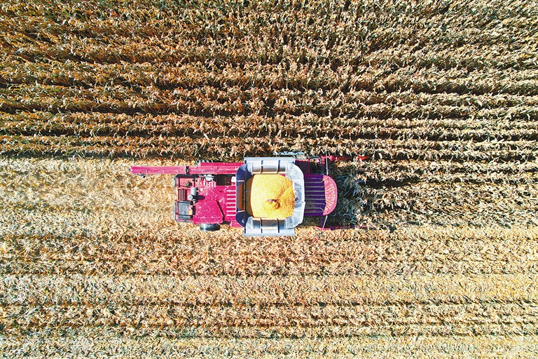 10月21日,在通辽市科尔沁区丰田镇哈拉满罕村博丰农机农牧业专业合作社的玉米地里,一台籽粒收割机正开足马力作业。机器驶过,玉米秆被迅速吞入,金黄的籽粒如流水般倾泻进仓储箱,实现了从田间直接脱粒到送收购企业,一步到位。