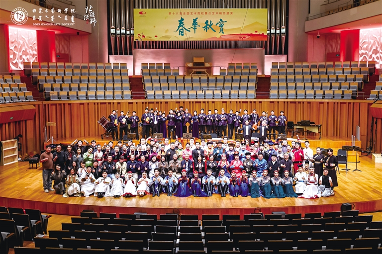 在国家重要活动中厚植爱国情怀、彰显文化自信。2024年中央广播电视总台春节联欢晚会上,内蒙古艺术学院安达组合携蒙古族英雄史诗《江格尔》亮相《永恒的诗篇》节目,以精湛的艺术演绎让民族瑰宝走进全国亿万观众视野,传递北疆文化的深厚底蕴。2025年,舞蹈学院36名学生光荣参演《正义必胜》文艺晚会“红星照耀中国”篇章,以刚劲有力的舞姿传承伟大抗战精神,诠释青年一代的使命担当。同年11月,第十八届“春华秋实”全国艺术高校精品展演在国家大剧院音乐厅启幕,内蒙古艺术学院专场演出《北疆沃野》作为开篇之作精彩登台,为1500余名首都观众呈现了一场兼具传统韵味与时代活力的艺术盛宴。