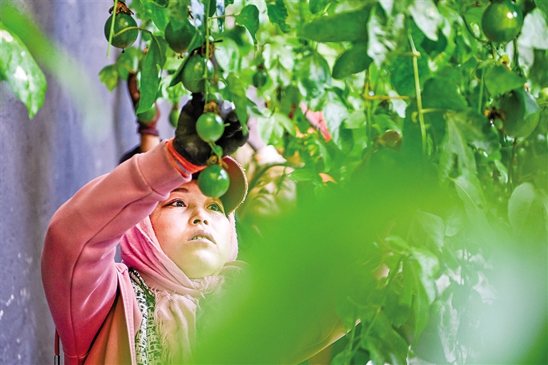 11月24日,乌兰浩特市乌兰哈达镇高根营子嘎查村民在高标准设施农业园区大棚内管护百香果。近年来,当地整合各级乡村振兴衔接资金,巧做“农业+旅游”文章,打造五个功能区的高标准设施农业园区,聚焦高端浆果、采摘研学、寒地果蔬和高新蔬菜种子研发等,形成了特色鲜明、优势互补的产业格局,助力乡村振兴。 本报记者
