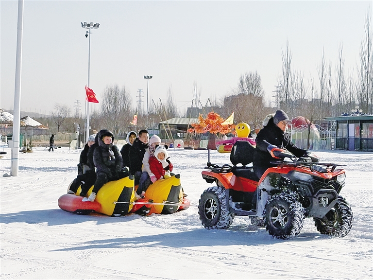 12月7日,游客体验雪上香蕉船。当日,鄂尔多斯市康巴什区乐水湾冰雪乐园内,人头攒动、热闹非凡。作为鄂尔多斯冰雪文化旅游季的重头戏,丰富多样的冰雪活动不仅承包了市民游客的冬日快乐,更点燃了冬季文旅消费热潮。本报记者 布音额尼尔乐 摄