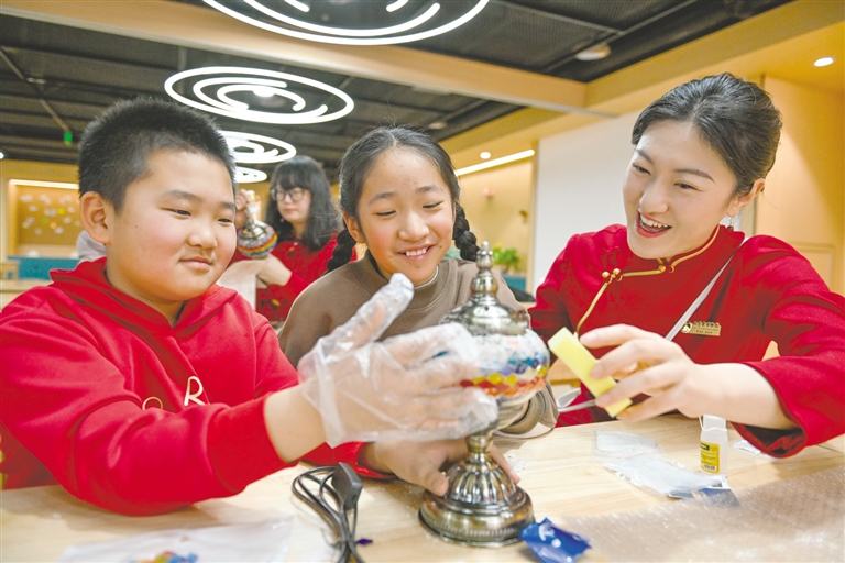 元旦假期,内蒙古博物院推出了“丝路对话过新年”主题活动,观众可以现场参与国宝天团巡游送好礼、N探空间闯关集福,以及趣味答题、手作体验等多项内容,在沉浸式互动中触摸丝路历史。图为小朋友和内蒙古博物院讲解员一同制作波斯釉彩小夜灯。 本报记者 王磊 摄