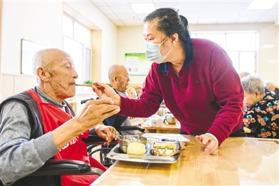 1月4日,在呼伦贝尔市扎兰屯市社会福利中心综合楼养老中心的老人正在护工的照料下就餐。该养老中心是“公建民营”试点项目,打造了集智慧平台、医养结合、老年助餐等为一体的中高端养老机构,通过进一步提升养老服务设施与服务品质,让老年群体在家门口享受到“环境优、服务全、有温度”的养老服务。本报记者 王晓博 摄