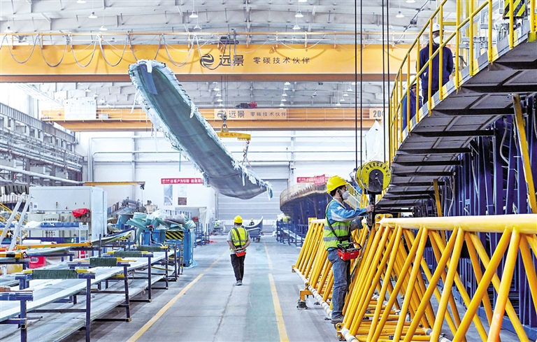 1月6日,在位于乌兰察布市察哈尔高新技术开发区的远景蒙新集团乌兰察布叶片生产基地,一片繁忙的生产景象。新年伊始,该基地的6条叶片生产线24小时满负荷运转,平均每天就有4至5支巨型叶片下线。据了解,该基地目前已具备年产1500支大兆瓦级风电叶片能力。 本报记者 王磊 摄