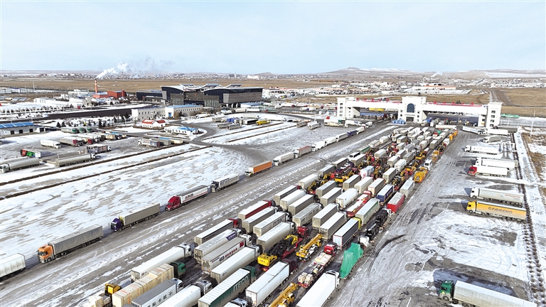 满洲里公路口岸2025年进出境货运车辆突破24.9万辆,同比增长39.9%。自2023年5月15日率先试行24小时通关以来,边检部门创新推行“大一站式”通关协作模式,开设大宗商品、鲜活产品等“绿色通道”,运用“人力+科技”融合查验,保障口岸全天候安全顺畅运行,通关效率显著提升。图为满洲里公路口岸货运车辆正有序通关。