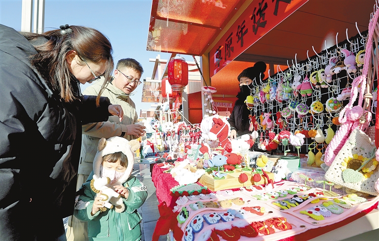 一旁,摊主李艳霞边忙碌,边高兴地说:“我带来了马年吉祥物、对联等小商品,在家门口的年货大集上摆摊,热闹不说,还接了很多订单呢。”