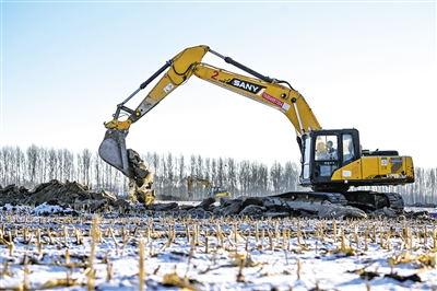 1月14日,在通辽市科左后旗常胜镇高标准农田建设现场,大型机械正在施工作业。近年来,内蒙古大力推进以高效节水为主的高标准农田建设,确保田、土、水、路、林、电、技、管“八配套”,亩均增粮10%以上,实现农业增效和农民增收。截至目前,全区累计建成高标准农田6281万亩。本报记者 孟和朝鲁 摄