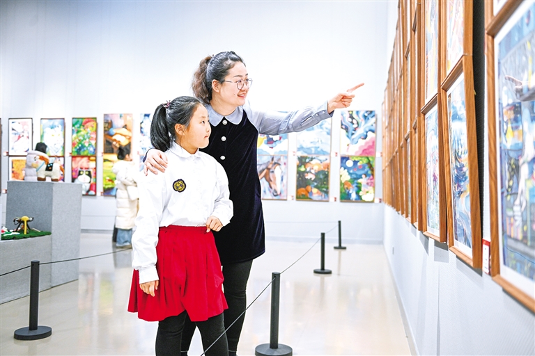 1月14日,观众参观青少年书画作品。当日,“稚笔生花·童墨溢彩”——2026全国青少年美育教育成果之书画作品展在内蒙古美术馆开展。本次展览是“全国青少年美育教育成果”在内蒙古的重要实践与集中呈现,旨在为广大青少年书画爱好者提供一个专业化、高水准的展示交流平台。本报记者 王磊 摄
