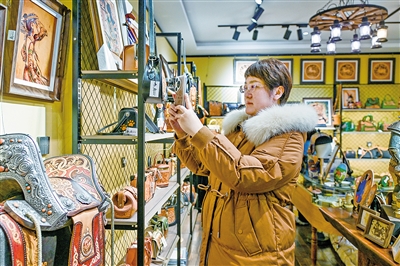 “通过培训学习,学员们能够全手工独立完成作品。据不完全统计,我们的学员中有900多名是牧民,空闲时,他们可以在自己的牧场制作产品拿去售卖;有600多名是学生,其中一部分毕业后实现了在相关领域的就业创业。” 苏力德介绍,“呼伦贝尔是一座旅游城市,皮雕产品约80%的消费者为中外游客,就业前景可观。”