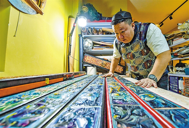 雕花的马鞍、奔腾的骏马、翱翔的雄鹰、牧人的脸庞……在苏力德的皮雕艺术世界里,一件件手工艺品的皮纹里浸染着呼伦贝尔草原的风情,雕刻着人与自然和谐共生的游牧时光。