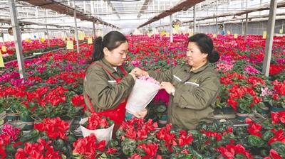 1月23日,工作人员正忙着打包花卉。通辽市庆云农业科技有限公司花卉种植基地内,5万盆精品大规格仙客来迎来盛花期,不仅吸引了市民和游客前来打卡观赏,还将在新春佳节到来之际,销往东北、华北等周边地区的花卉市场。本报记者 鲍庆胜 摄