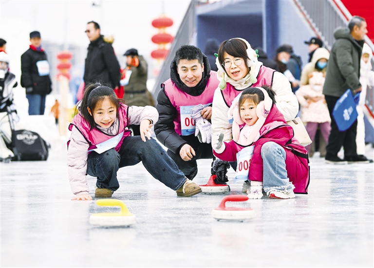 1月25日,小朋友们进行冰壶比赛。当日,2025—2026年大众冰雪季冰雪战队联赛活动在呼和浩特市东河冰雪场开赛,现场设置冰上龙舟等7个趣味竞技项目。2025至2026年冰雪季,内蒙古以159项特色文旅活动、48项赛事、45条精品线路为牵引,构建起“一地一特色、月月有精彩、全域皆可游”的冬季旅游发展格局,推动冰雪经济持续升温。 本报记者 孟和朝鲁 摄