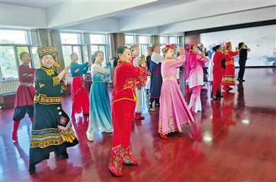 舞蹈室里,红石榴艺术团的成员们踩着明快节拍舒展身姿,扇舞的飘逸与安代舞的奔放相映成趣。“退休后在家闷得慌,现在每天来跳舞,认识了好多老姐妹,日子过得充实又开心!”62岁的居民张阿姨擦着额头的薄汗,脸上满是笑意。这个多功能舞蹈室从清晨到日暮被12支文艺队伍轮番使用,周计划表上的排练安排密密麻麻但又井然有序。