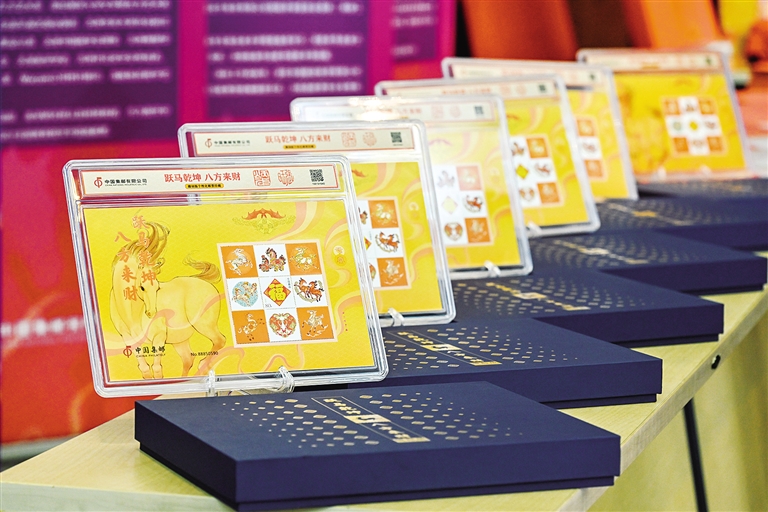 这是活动现场摆放的《跃马乾坤 八方来财》雕刻版生肖主题邮票珍藏摆件(1月29日摄)。1月29日,中国集邮有限公司在北京举办以“年货迎祥·骏驰纳福”为主题的年货节暨生肖产品发布活动。活动聚焦生肖文化与年货消费需求,发布《跃马乾坤 八方来财》雕刻版生肖主题邮票珍藏摆件和《骏驰元宇》邮票珍藏册等多款生肖文化年节礼品,邀请多位邮票设计师现场分享设计理念,传播生肖文化。 新华社记者 李鑫 摄