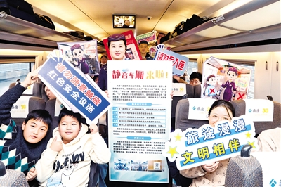 2月1日,中国铁路上海局集团有限公司合肥客运段在G54次列车上进行“静音车厢”宣介活动。自2月1日起,高铁“静音车厢”服务将拓展至除动卧列车之外的“D”字头、“G”字头部分列车,全国铁路提供“静音车厢”服务的列车将超8000列。 新华社记者 杜宇 摄