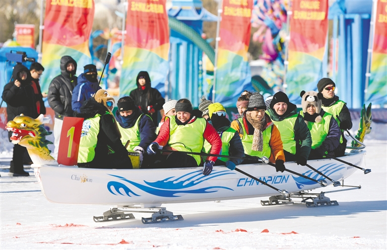 2月2日,参赛选手在锡林浩特市举行的五大洲冰上龙舟挑战赛中奋力冲刺。来自中国、俄罗斯、美国、英国、德国等21个国家和地区的29支队伍、近600名运动员齐聚草原冰场,以冰为媒、以舟会友,展开一场融合力量、速度与团队精神的精彩角逐。 本报记者 巴依斯古楞 摄