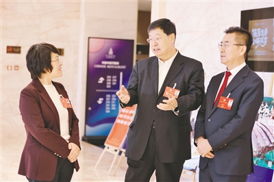 2月5日下午,自治区政协常委杜凤莲(左)与自治区政协委员马保国(中)、郭建君就打造我国向北开放重要桥头堡进行交流。 本报记者 贾奕村 摄