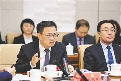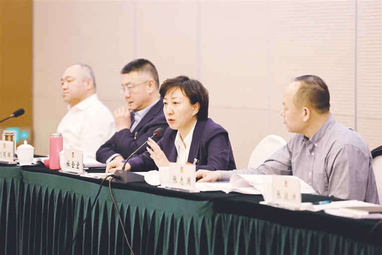 2月5日下午,自治区政协委员杜金宏(右二)就自治区优质绿色农畜产品品牌建设提出建议。本报记者 贾奕村 摄