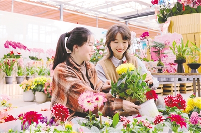 2月5日,在河南省济源市联洋花卉市场,市民选购花卉。新春将至,年味渐浓。各地举办年货大集、写福字春联等活动,人们选购鲜花、中国结等饰物,迎接新春。 新华社发