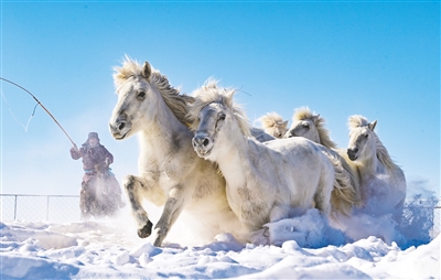 2月5日,牧民在凤凰马场的雪原上驯马。2月5日,位于内蒙古自治区锡林郭勒盟锡林浩特市的凤凰马场举办“策马踏雪迎新春”主题活动,当地牧民在雪原上驯马,呈现雪原奔马壮观景象,喜迎马年春节。