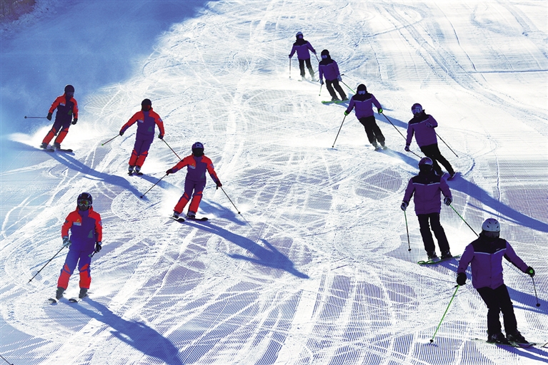 “保持距离,注意安全。”在魔毯旁,身为滑雪场安全巡逻员的村民张然有序引导着游客。“每年来我们村滑雪的人很多,冬闲在家我就来这里打工,月薪2700元。”张然说。