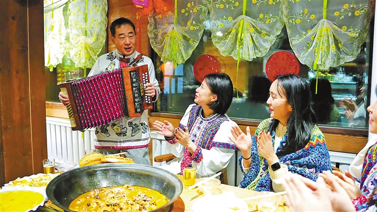 踏入恩和俄罗斯族民族乡,“木刻楞”民居静立雪原,红灯笼与彩灯相映成趣。列巴房麦香四溢,游客们亲手体验传统面包制作,来自哈尔滨的游客李艳笑着说:“亲手揉面才懂这份文化韵味,雪地里的年味儿太特别了!”午后,马拉爬犁穿梭白桦林,雪原骑行的欢笑声回荡林间。暮色中,民居内暖意融融,游客与村民围炉品尝苏巴汤、格得列克,一同包饺子、话家常,来自天津的游客王春祥感慨:“和当地人一起唱歌热闹提前感受过节,这份温情太难得了!”手风琴拉起,众人载歌载舞,喜悦氛围拉满。