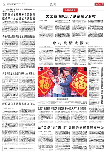 说起春节期间的节目编排及演出,队长王和平自豪地介绍:“我们文艺宣传队从腊月十六开始,每天坚持集中排练1小时,等节目成熟后,将于正月初九开始,到哈乐镇、哈乐镇的各村委会及四子王旗东八号乡各村巡回演出,为周边群众送上喜闻乐见、年味浓郁、欢乐祥和的新春文艺大戏。”