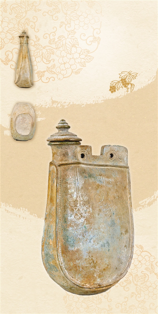 绿釉划花扁身双孔鸡冠壶腹部刻有葡萄纹,这个借鉴中原瓷器的纹饰既为器物增添雅致,又有福寿延绵的吉祥寓意。