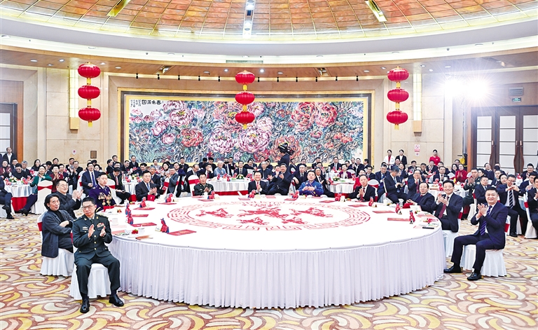 新城宾馆国宴厅内张灯结彩,与会各界人士互致问候、祝福新春,现场洋溢着欢乐喜庆的节日气氛。