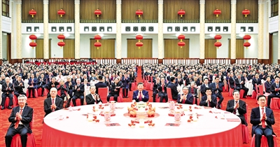 人民大会堂宴会厅灯光璀璨、喜气洋洋,各界人士2000多人欢聚一堂、共迎佳节,现场洋溢着欢乐祥和的节日气氛。