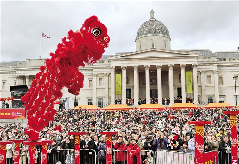 2月22日,演员在英国伦敦市中心的特拉法加广场表演舞狮。当日,英国伦敦特拉法加广场举行庆典,庆祝中国农历春节。 新华社记者 李颖 摄