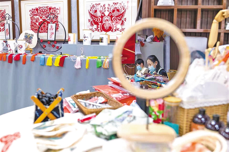 在这里,残疾人学员张小霞正细心制作宋锦挂件。2024年9月来到中心后,她先后学习了宋锦、剪纸、掐丝珐琅等多项非遗技艺。“这里不仅提供了就业岗位,更让我感受到了温暖和信心。”张小霞说。