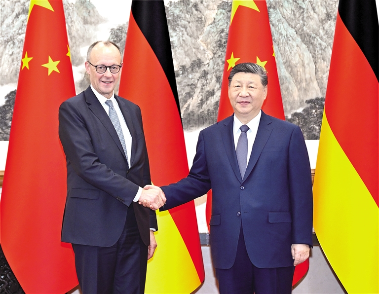 默茨表示,很高兴在中国人民欢庆春节的时候来华访问,祝中国人民马年吉祥。■下转第4版  ■上接第1版  德中建交以来保持着友好交往和密切合作,为两国人民带来福祉。德方珍视对华关系,坚定奉行一个中国政策,愿同中方一道,延续友好传统,坚持相互尊重、开放合作,不断深化两国全方位战略伙伴关系。德国企业界高度重视中国市场,希望进一步深化对华合作,实现互利互惠、共同发展。国际局势正在发生深刻变化,德中肩负着共同应对全球挑战的重要责任。德方期待同中方加强协调,坚持自由贸易,反对保护主义。欧盟同中国发展可靠和持久的经贸合作关系符合双方利益,也有利于世界稳定繁荣,德方支持欧中加强对话与合作。