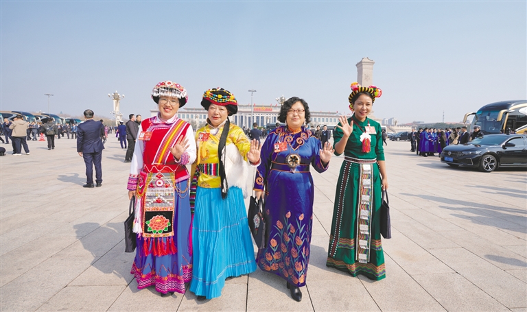 3月8日,女委员们在天安门广场合影留念。当日是“三八”国际劳动妇女节,参加全国两会的女代表、女委员履职尽责、建言献策,尽显新时代巾帼风采。本报记者 王鹏 摄