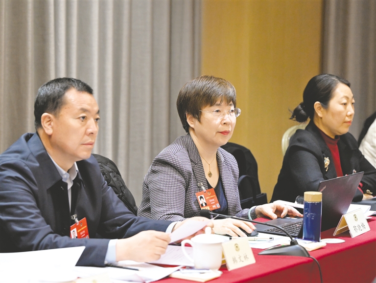 3月8日,全国政协委员鄂晓梅(左)在讨论民族团结进步促进法草案时建议,出台实施细则,将相关法律条文细化为可操作、可落地的具体举措。 本报记者 韩卿立 摄