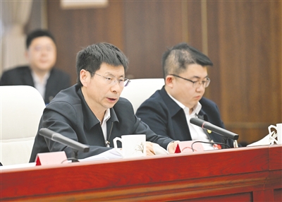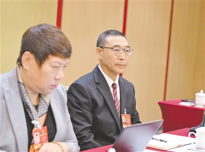 3月9日,全国人大代表及永乾(左)建议,支持呼伦贝尔市全域陆港基础设施和满洲里产业协作园区建设。 本报记者 孟和朝鲁 摄