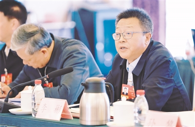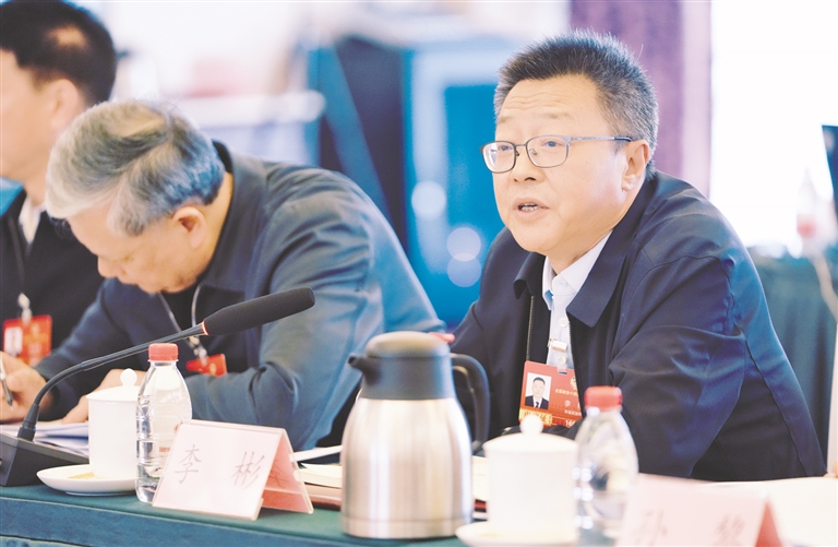 | 3月8日,全国政协委员李彬(右)围绕统筹山水林田湖草沙一体化保护和系统治理建言献策。 本报记者 王鹏 摄 |