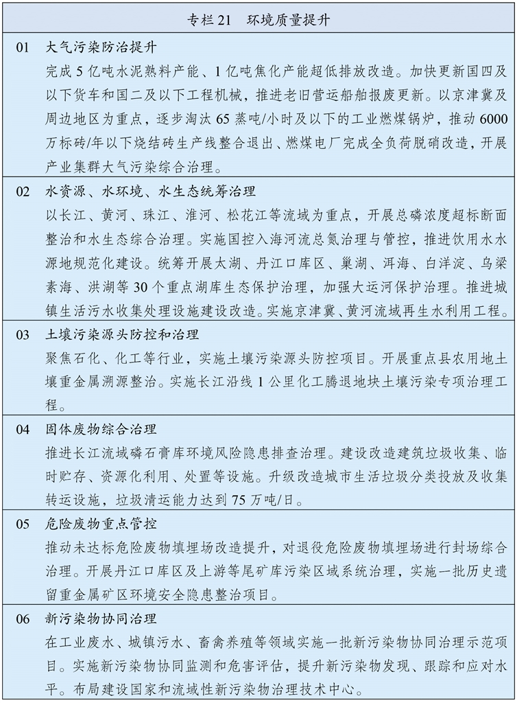 持续深入推进污染防治攻坚,以更高标准改善大气、水、土壤环境质量。以京津冀及周边、长三角、汾渭平原等重点区域为主战场,强化细颗粒物(PM2.5)控制,深入推进重点行业超低排放改造,推动挥发性有机物源头替代和全流程治理,制定下一阶段机动车排放和油品质量标准,深化大气环境绩效分级管理,氮氧化物、挥发性有机物排放量分别下降8%以上,进一步消除重污染天气。加强长江中游、成渝等区域大气污染防治。加强餐饮油烟、恶臭异味和环境噪声污染治理。统筹水资源、水环境、水生态治理,以解决全流域和跨省界突出问题为重点,加强重要江河湖库系统治理和生态保护,基本完成重点流域海域入河入海排污口排查整治,化学需氧量、总磷排放量分别下降6%,巩固城市黑臭水体治理成效、基本消除县乡黑臭水体。加强土壤污染源头防控,推进受污染耕地、建设用地安全利用。