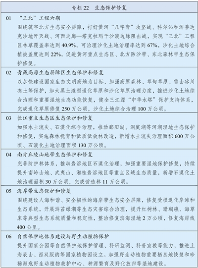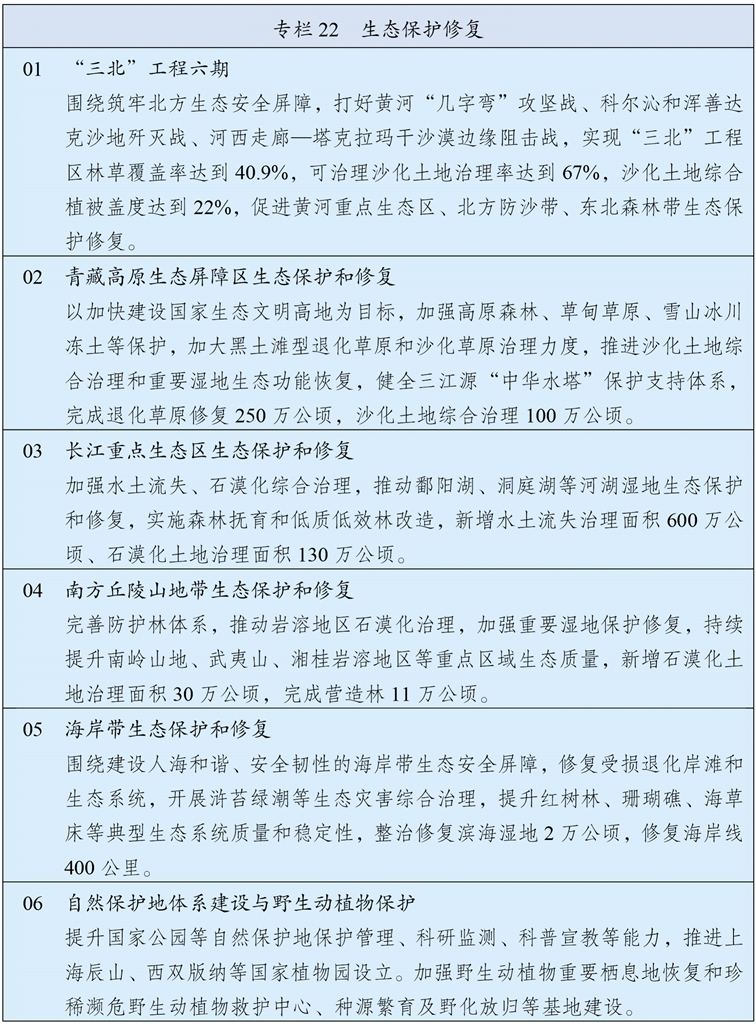 统筹推进重要生态系统保护和修复重大工程,持续巩固以“三区四带”为骨架的国家生态安全屏障体系。打好“三北”工程攻坚战,推动三大标志性战役取得决定性胜利。深入推进青藏高原生态保护,加强重点区域水土流失治理和石漠化治理。科学开展大规模国土绿化行动,推进森林质量精准提升和国家储备林建设,森林蓄积量达到224亿立方米,统筹草原生态修复与合理利用,加强湿地保护修复。推进超引地表水和超采地下水治理,开展历史遗留废弃矿山生态修复。
