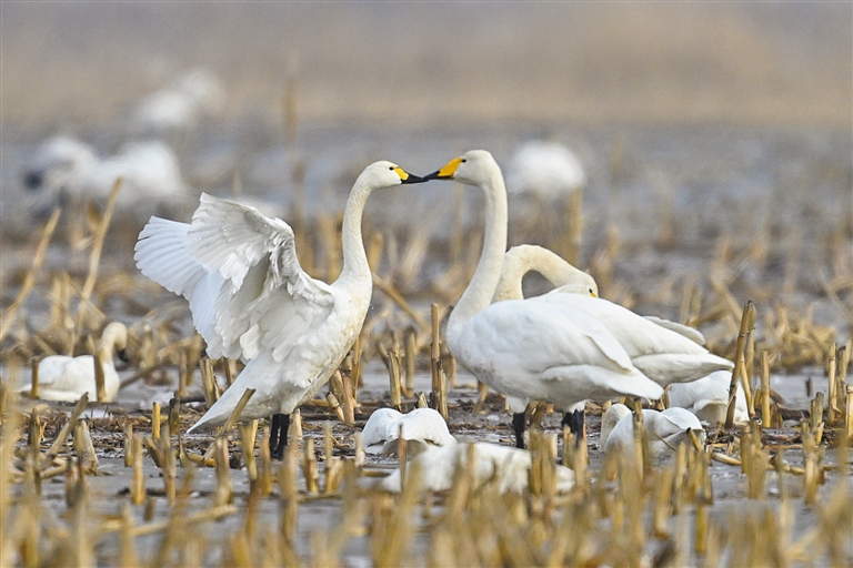 春回大地,万物复苏。包头市土默特右旗境内的黄河湿地迎来了迁徙天鹅,它们栖息觅食、悠闲漫步、振翅起舞,构成一幅生机盎然的生态画卷。
