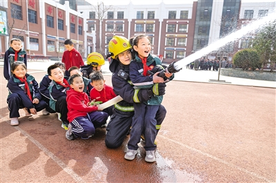 3月23日,同学们在消防员的指导下操作消防水枪。当日,在第31个全国中小学生安全教育日来临之际,呼和浩特市玉泉区恒昌店巷小学五里营校区联合教联体共建单位呼和浩特市玉泉区南二环路消防救援站,开展消防安全应急疏散演练与主题教育系列活动。本报记者 王磊 摄
