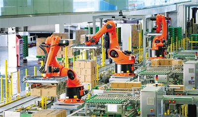 3月25日,在呼和浩特市伊利现代智慧健康谷液态奶全球智造标杆基地,机械臂在码放装箱的成品。为确保乳制品市场供应,伊利集团全国各地的工厂积极调整产品结构,对现有人员进行合理调配,全面满足生产运营需求,力争实现首季度“开门红”。本报记者 王鹏 摄