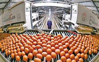 3月25日,在内蒙古绿水清山农牧科技有限公司高标准产蛋鸡舍,鲜鸡蛋通过传送带送往分装车间。据了解,该公司年产富硒鲜蛋11000吨,年实现产值1亿元,带动200余劳动力就近就业。近年来,该公司所在地赤峰市元宝山区通过政府引导和企业带动,建成集富硒鸡蛋研发、鲜蛋加工贸易、有机饲料加工、养殖技术服务为一体的蛋鸡产业链,有效拉动就业,助力乡村振兴。本报记者 孟和朝鲁 摄