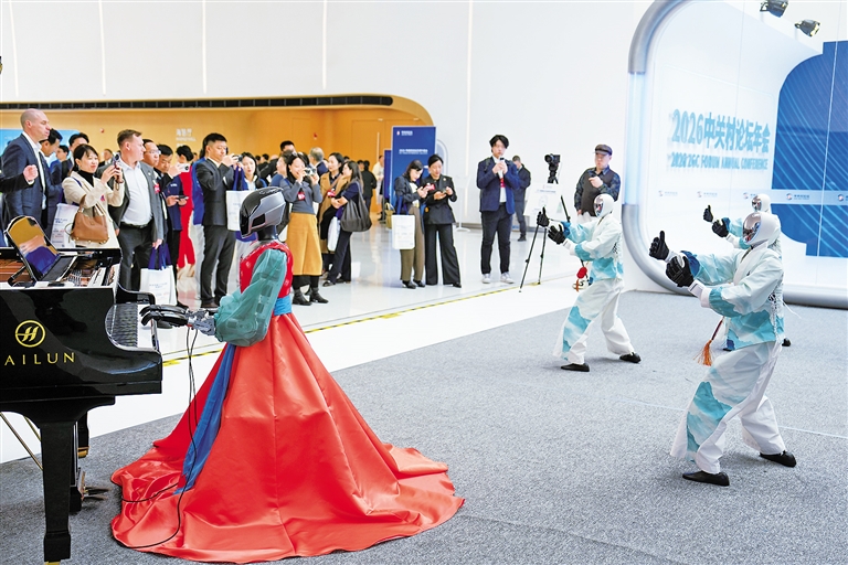 3月25日,在中关村国际创新中心,机器人在演奏乐器,表演舞蹈。3月25日,2026中关村论坛年会在北京开幕。本届论坛年会主题为“科技创新与产业创新深度融合”,设置论坛会议、成果发布、技术交易、前沿大赛、配套活动五大板块,共百余场活动。 新华社记者 鞠焕宗 摄