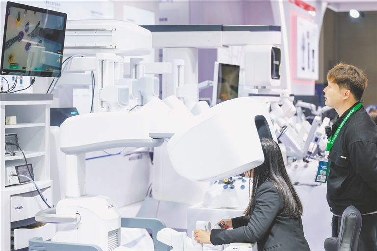 3月29日,观众在2026中国医学装备展览会上参观体验外科手术机器人。2026医学装备大会暨医学装备展览会3月26日至29日在重庆国际博览中心举行,超800家企业参展,众多医学装备创新成果与前沿技术集中亮相。新华社记者 黄伟 摄