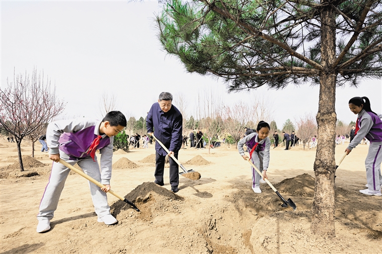 挥锹铲土、培土围堰、提水浇灌……习近平接连种下油松、北京牡丹、榆叶梅、杜仲、元宝枫等多棵树苗。他一边植树,一边询问孩子们的学习生活、劳动锻炼和参加植树情况。习近平强调,青少年像小树苗一样充满活力和希望,要从小树立远大志向,爱知识、爱劳动、爱自然,德智体美劳全面发展,努力成长为栋梁之材。现场气氛热烈,一派繁忙景象。