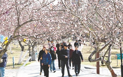 3月30日,市民在呼和浩特市公主府公园观赏桃花。随着天气转暖,公主府公园内千余株桃树枝头挂满粉嫩花苞,部分桃花已悄然绽放,吸引众多市民前来赏花。据了解,呼和浩特将于4月7日至5月15日开启“花漾青城赏花季”活动,市民游客可以沿着赏花地图打卡春色,邂逅春日青城的多彩风景。本报记者 孟和朝鲁 摄