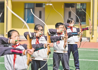 3月31日,呼和浩特市新城区八一路小学的学生正在体育课上练习射箭。为提高学生综合素养,该校开设射箭、武术套路、摔跤等特色课程,并邀请专业指导员授课,让学生们在强身健体的同时,感受中华优秀传统文化的魅力。